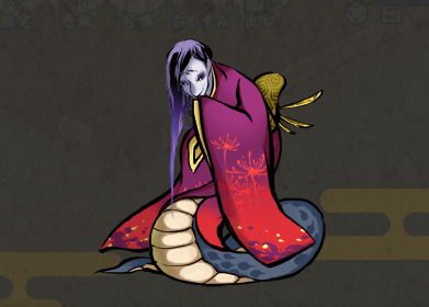 綺麗な女性の姿をしており、その姿に釣られ声を掛けた人間を、巨大な蛇の尾と髪で纏わり付き血を吸い取るという。