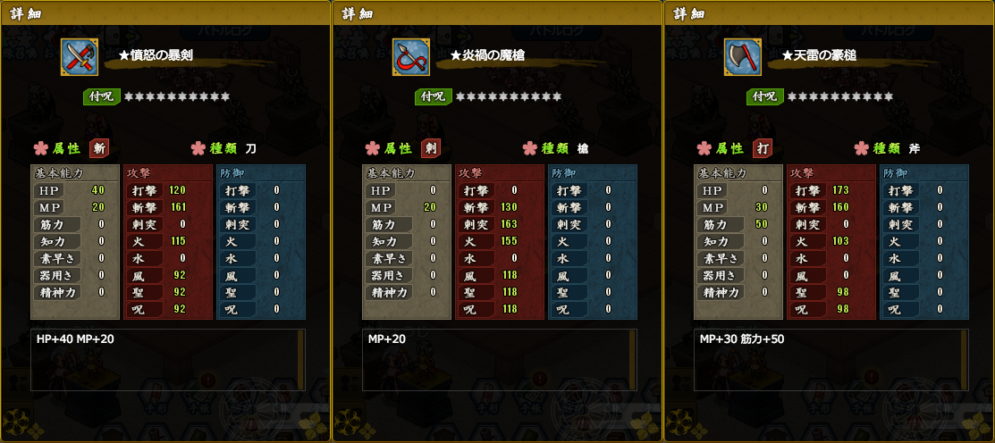 | 炎の魔神(羅) | 10 | 1,096,000 | 100%~?%(15000) | 炎魔の勾玉(武器) 炎剣の欠片 焼け焦げた殻 |